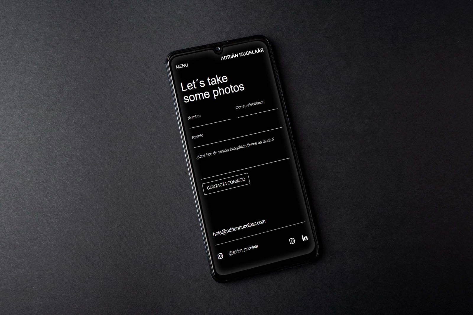 Adrián Nucelaar es un fotógrafo de moda reconocido por trabajar con personajes famosos. Buscaba un sitio web que reflejara su talento y personalidad de forma rompedora y visual. El objetivo principal era diseñar un portfolio de fotografía único que destacara sus sesiones fotográficas con una estructura impactante. Para lograrlo, se definieron los siguientes requisitos